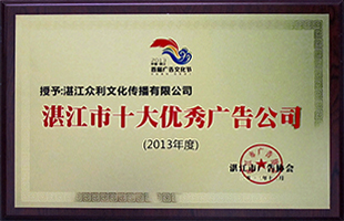 -湛江首屆廣告文化節(jié)眾利榮獲“湛江市十大優(yōu)秀廣告公司”稱號。