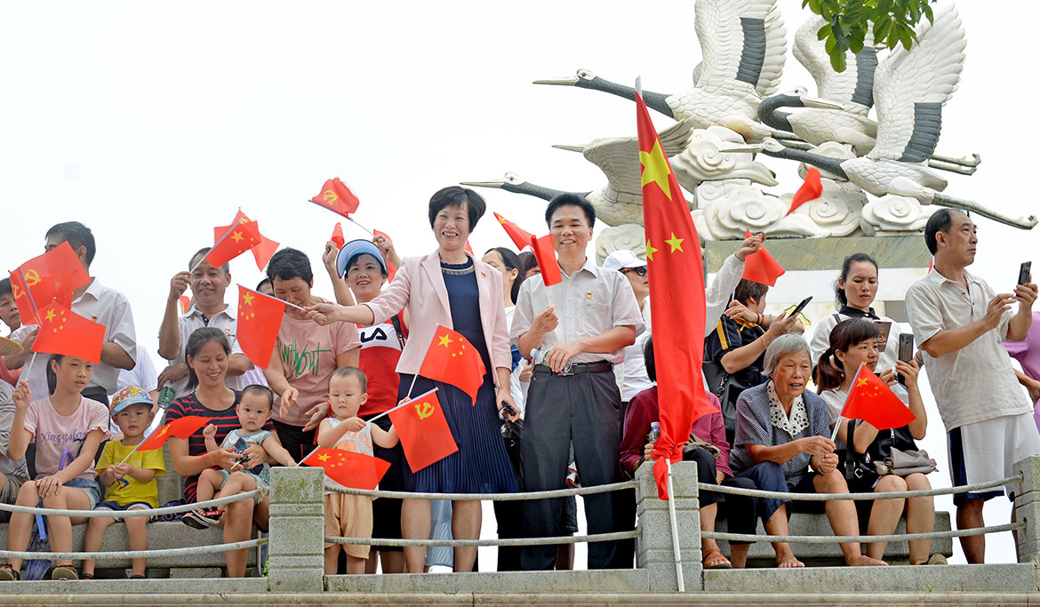 活動尾聲時,現(xiàn)場一起揮動手中的國旗和黨旗來了個大合影