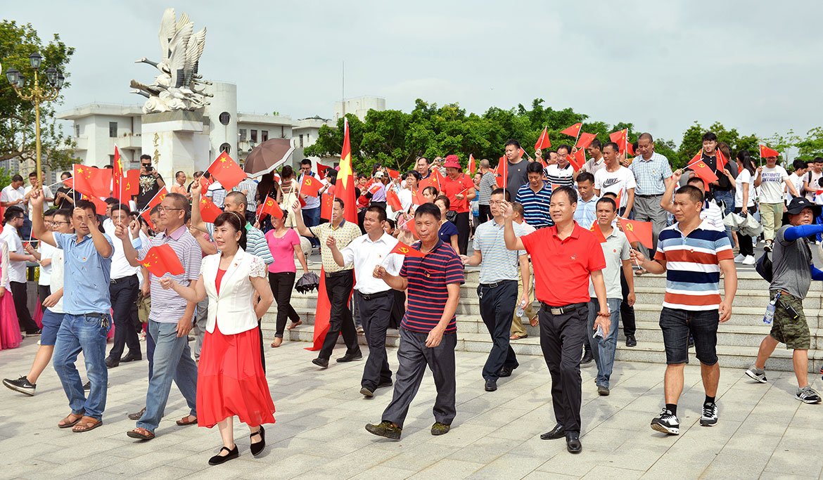 參觀結(jié)束后,在鶴地水庫水文化公園廣場開始合唱表演,1200多名黨員、“湛江好人”代表、廣東文理學(xué)院合唱團(tuán)、少兒合唱隊、志愿者等2000余人手握國旗和黨旗,現(xiàn)場圍觀群眾也情不自禁地紛紛加入,共同唱響對祖國的贊歌。