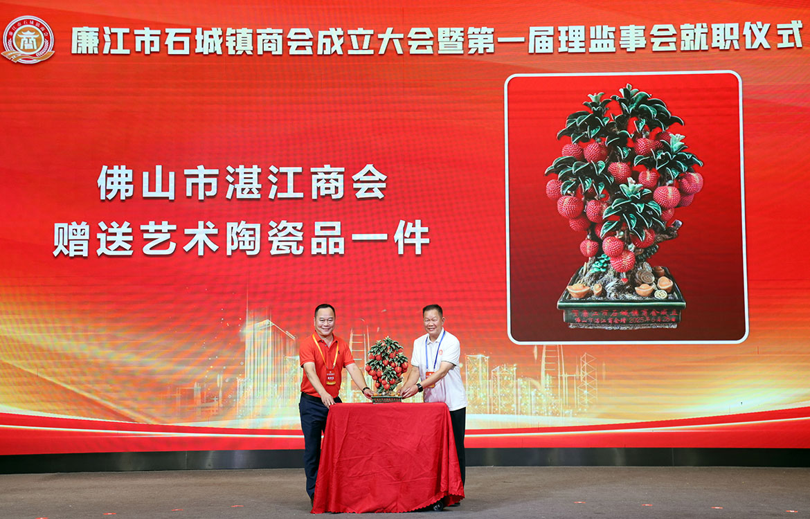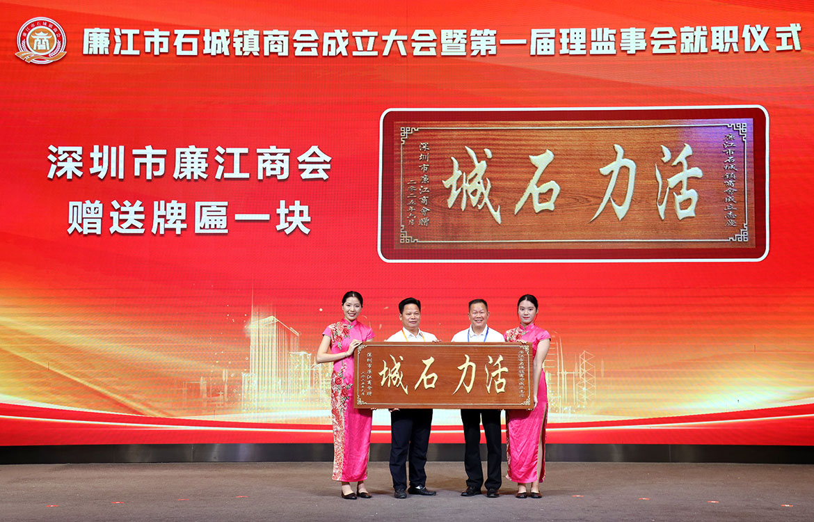 兄弟商會深圳市廉江商會、佛山市湛江商會、深圳市廉江石城商會、東莞廉江商會長安分會、廉江市羅州街道商會、廉江市城北街道商會、廉江市城南街道商會、廉江市吉水鎮(zhèn)商會、廉江市石頸鎮(zhèn)商會,為慶祝廉江市石城鎮(zhèn)商會成立分別贈送了紀念品。